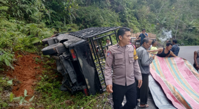 Kasi Humas Polres Tapteng, AKP Horas Gurning mengatakan, mobil pick up tersebut keluar jalur ke kiri, kemudian terperosok, dan terbalik ke pinggir jalan yang menikung.