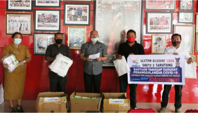 1. Alumni SMP Negeri 2 Tarutung Tahun 1992 yang disampaikan oleh Hotma Tobing, Tulus Simanjuntak dan Rosianna Togatorop berupa : APD baju Hazmat Suit 40 pcs, Masker 40 kotak, faceshield 40 pcs dan shield blend 10 botol