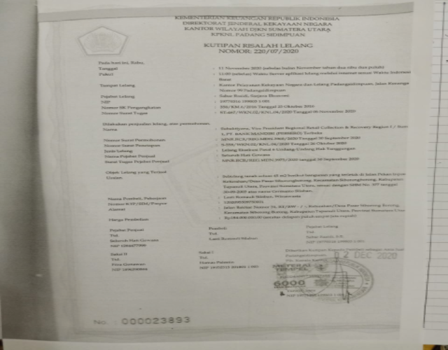 Dia menjelaskan melalui kutipan risalah lelang nomor 220/07/2020 kantor  pelayanan kekayaan negara dan lelang Padangsidimpuan, jalan kenanga nomor 99, dengan pejabat lelang Sabar Rasidi SE dengan surat tugas ST-167/WKN.02/KNL.04/2020 taggal 06 Nopember 2020