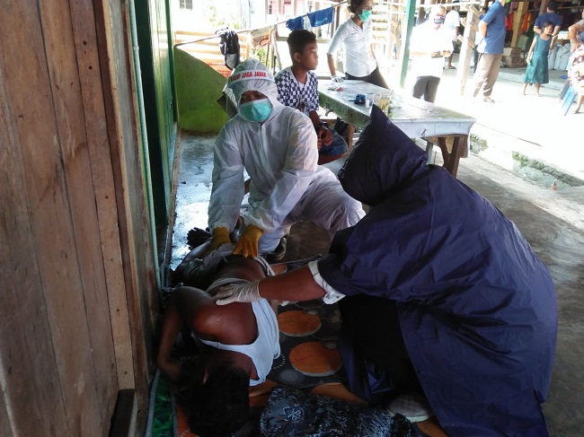 Serta mengevakusi jenazah secara SOP covid-19, yang menggunakan pakaian APD. (R)