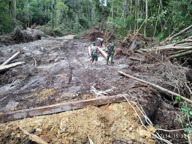 Terpantau, Rabu (15/07/20). Jembatan Satgas bersama masyarakat membangun jembatan kayu, merupakan akses penting transportasi masyarakat sekitar, yang selama ini kesulitan melintas.