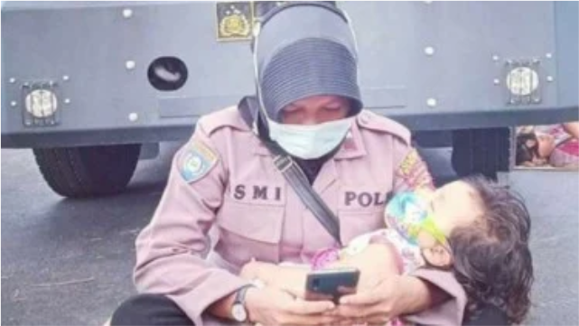 Viral,, Seorang Polwan Gendong Anak Saat Amankan Sidang